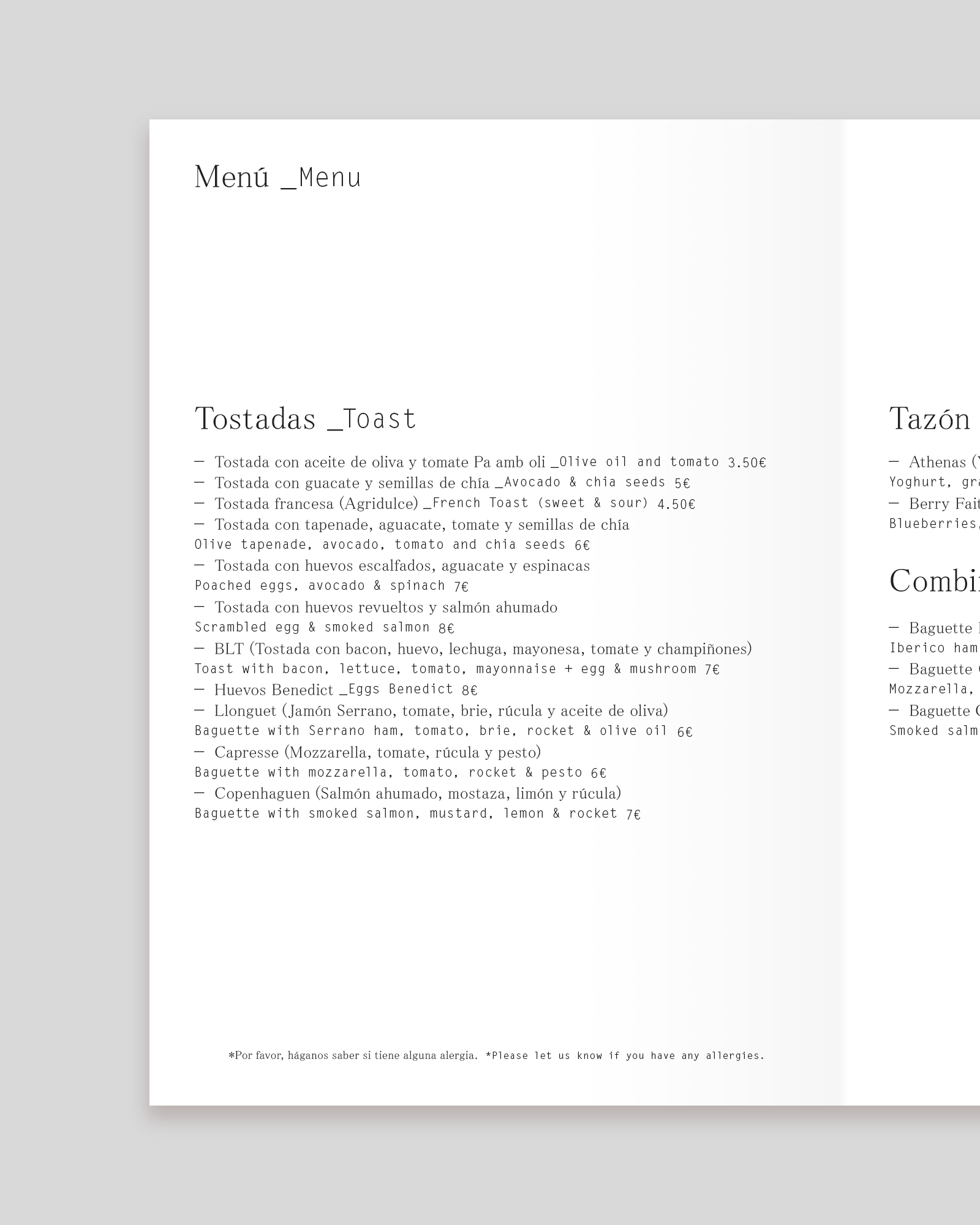 Food and drink menus for Buenavida.
